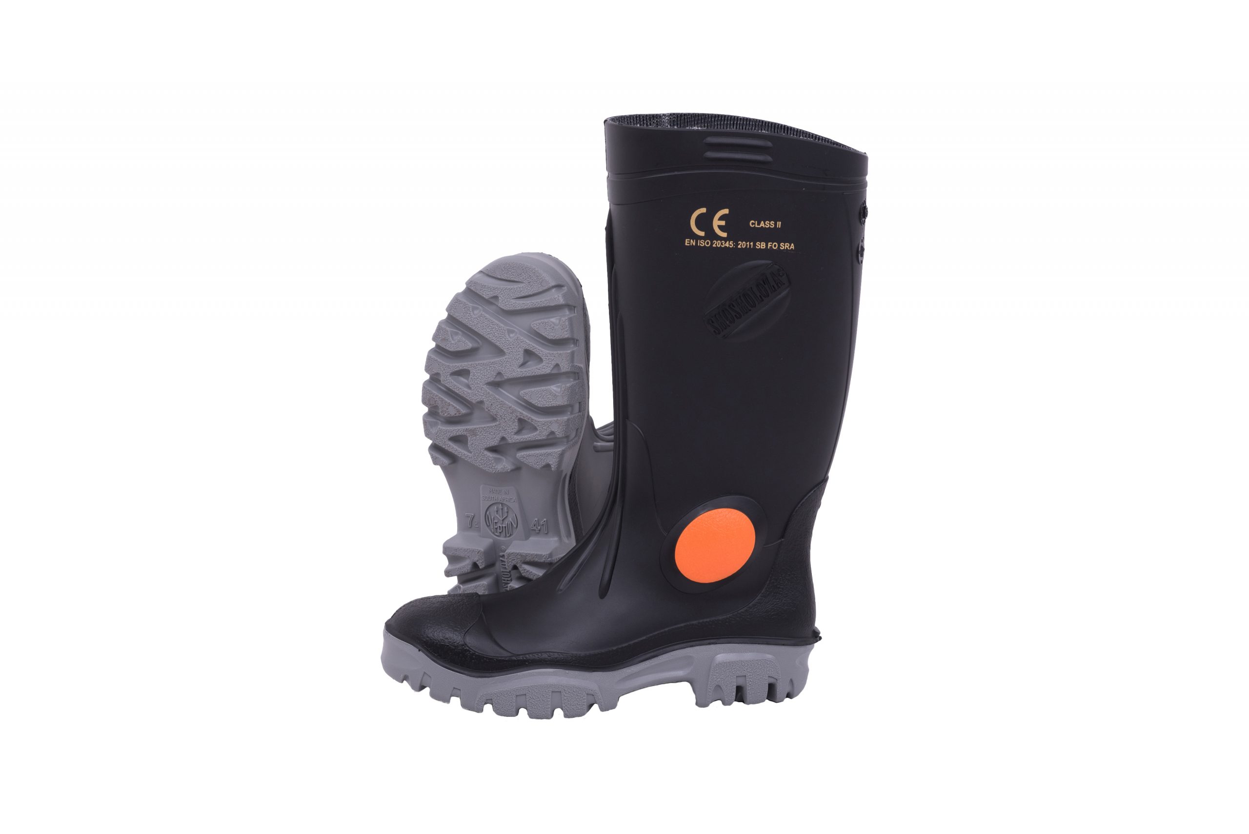 The black-grey Stimela is a heavy-duty knee-length PVC mining gumboot with a steel toe cap for protection. With an average weight of 2.4kg, they are hard wearing and have excellent grip and sole support.